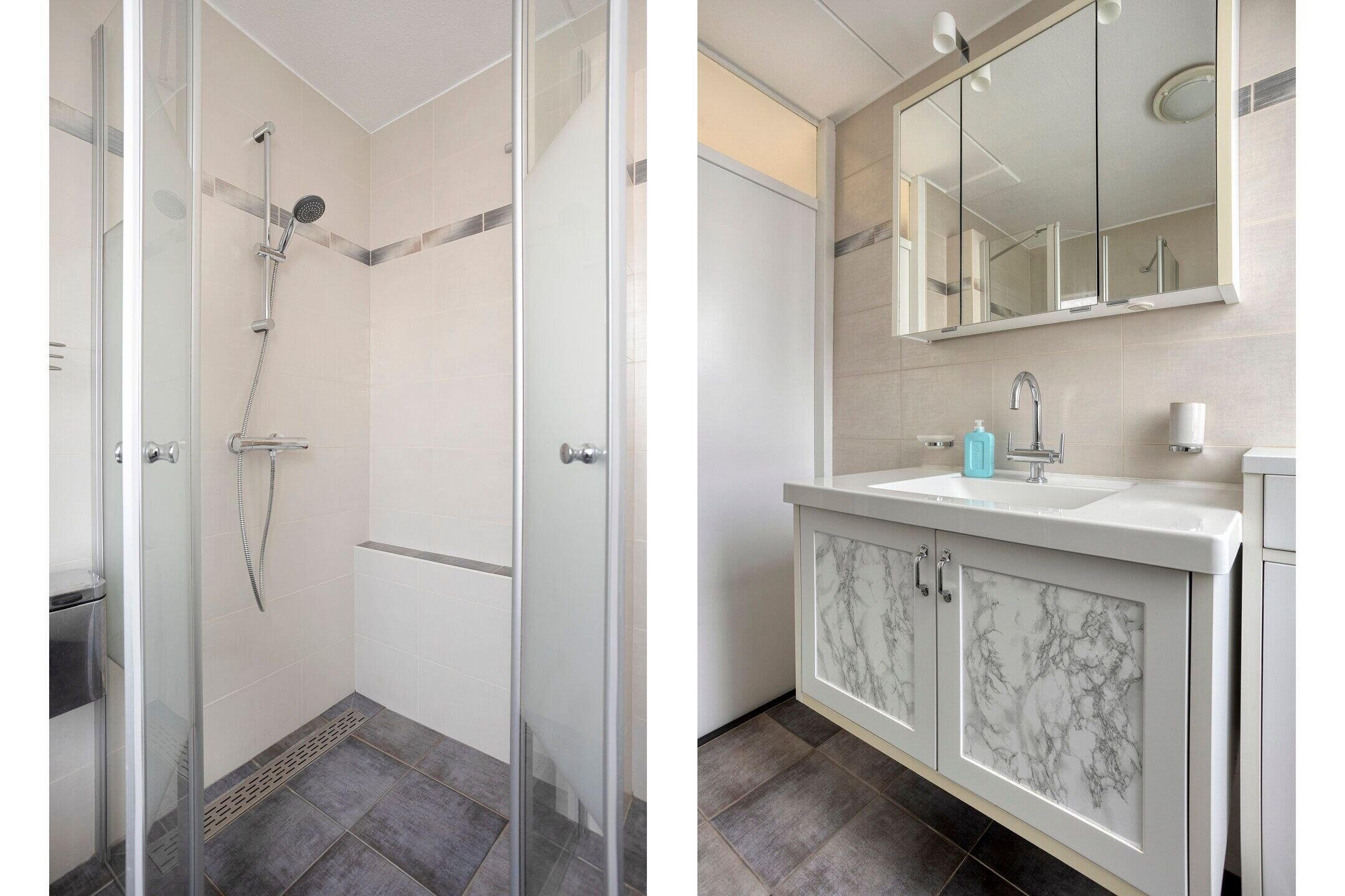 Overloop met toegang tot drie slaapkamers, geheel voorzien van laminaatvloer. De nette badkamer beschikt over een douche, wastafel en toilet.