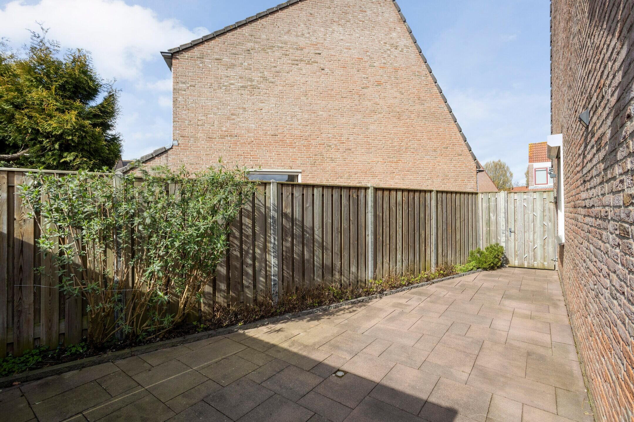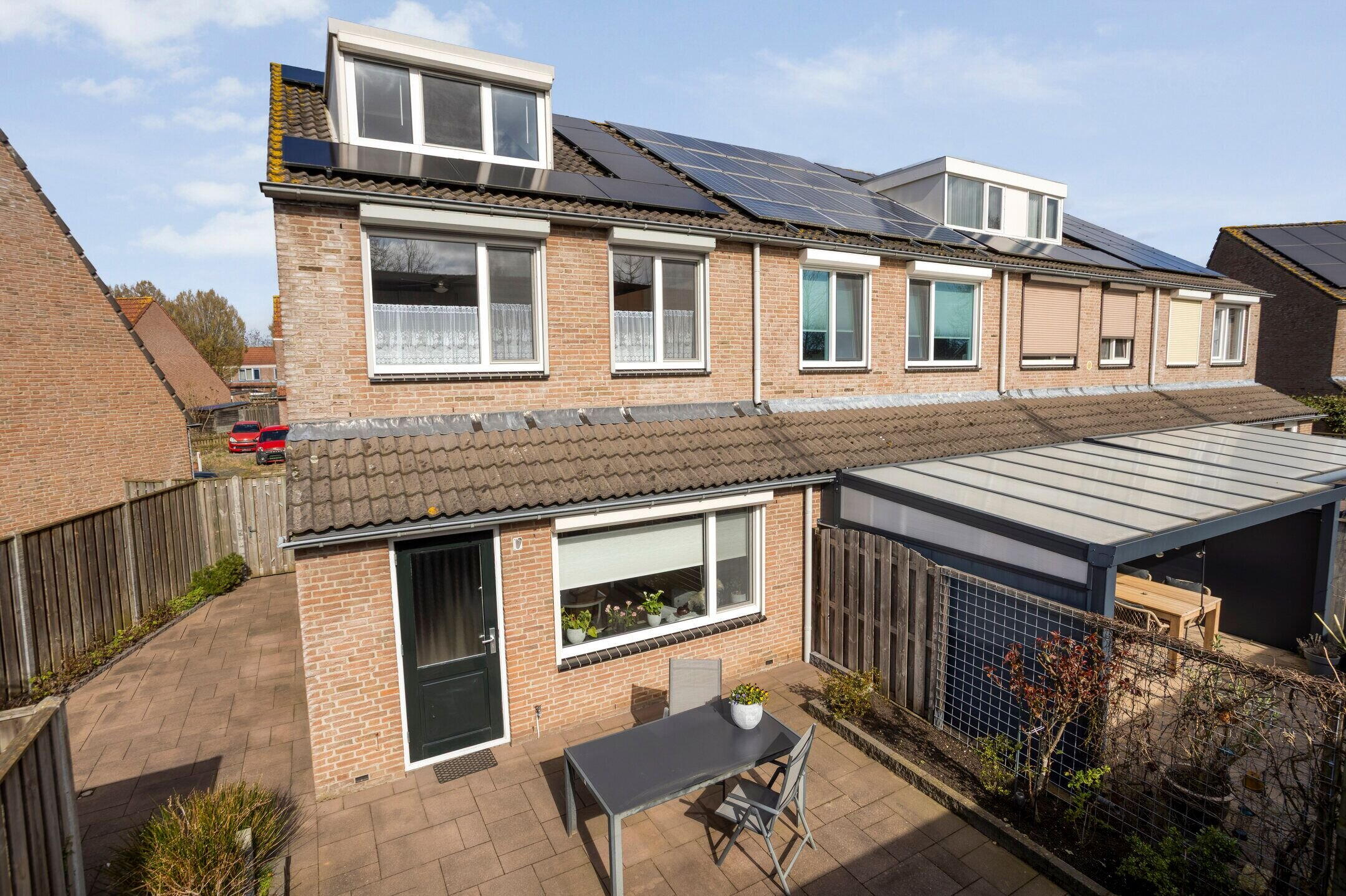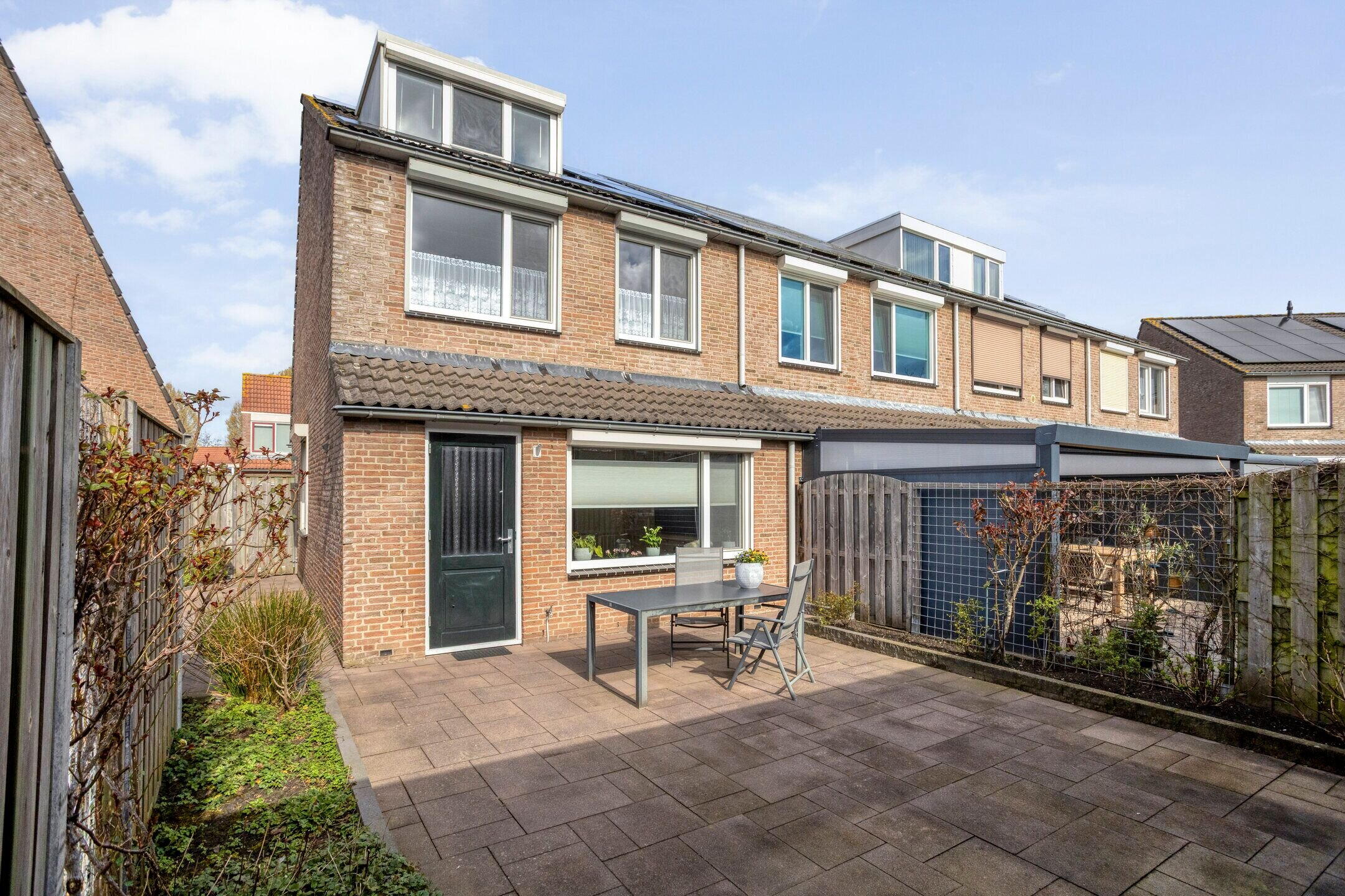 De achtertuin is verzorgd aangelegd met een ruim terras en groene borders, gelegen op het zuiden en met een achterom via de overkapping. De tuin is tevens via de zijkant van de woning bereikbaar, wat praktisch is voor bijvoorbeeld fietsen of tuinonderhoud.