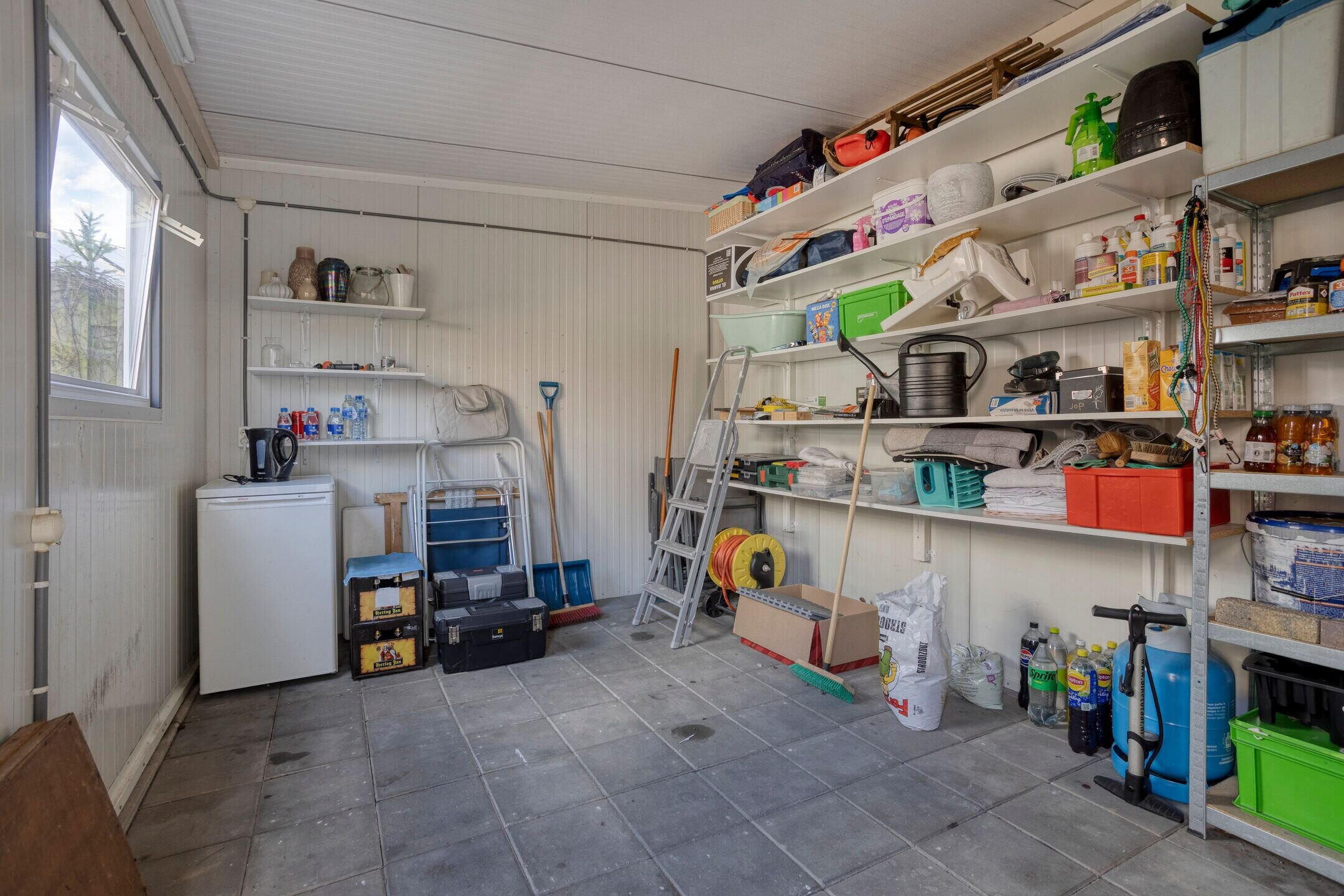 In de tuin bevindt zich een praktische berging met elektra-aansluiting, ideaal voor het stallen van fietsen en het opbergen van tuinspullen. Aansluitend de overkapping met de achterpoort.